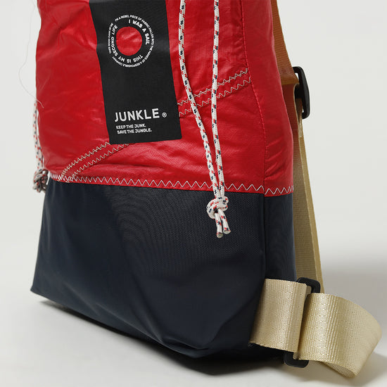Esterno e fodera in vele spinnaker (un nylon leggerissimo e forte) usate, recuperate nelle rimesse dei porti del Mediterraneo. Fondo in tessuto impermeabile.Colore Rosso/Grigio scuro. Cinghie in beige.