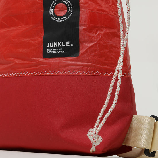Esterno e fodera in vele spinnaker (un nylon leggerissimo e forte) usate, recuperate nelle rimesse dei porti del Mediterraneo. Fondo in tessuto impermeabile.Colore Rosso/Rosso. Cinghie in beige.